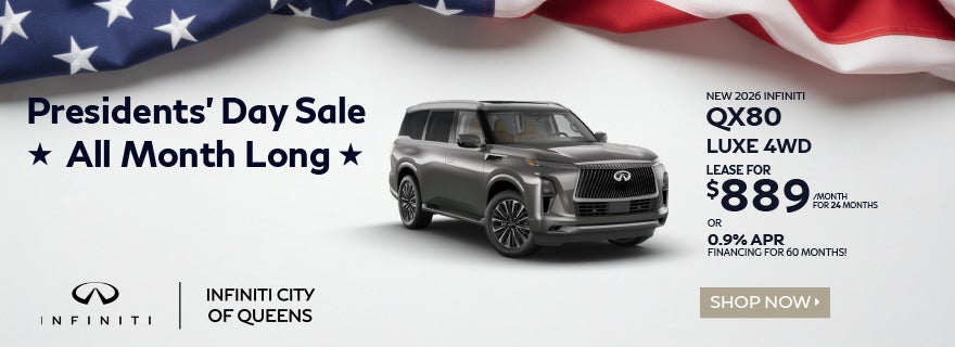 Lease a New 2026 QX80 LUXE 4WD (Example VIN: JN8AZ3BBXT9430214) for $889 a month for 24 months with $10,450.41 down payment, plus 1st payment, upfront fees, registration and taxes. Subject to Tier 1 credit approval, not all will qualify. No security deposit required. Lease selling is based on MSRP of $98,055. Late fees, early termination fee, excess wear and tear, auto insurance, scheduled maintenance, and $.25 per mile over 10,000 miles per year apply. Offer expires 03/02/2026.